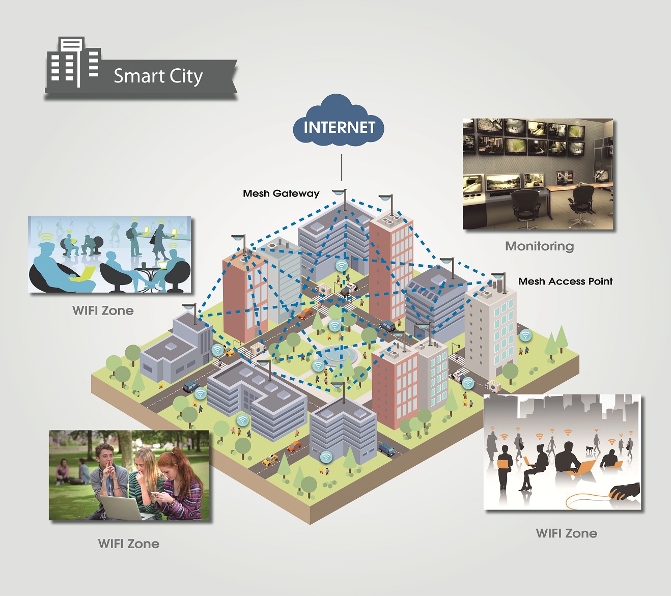 智慧城市利用網際網路與先進的無線網狀網技術做數據採集和通信互聯, 以解決城市面對的許多挑戰,如污染,節能,安全,停車,交通,運輸等等。無線網狀網技術提供交通,通訊,視頻監控, 以及對整個城市分佈設備和傳感器數據管理等不同方面的實時遠端監控。有了無線網狀網技術,一個社會就具備創造智慧環境的能力。