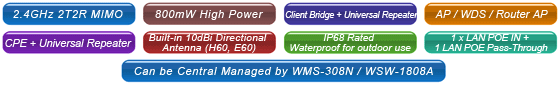 IEEE802.11n 2.4GHz 2T2R 300Mbps MIMO 室外無線橋接器/無線骨幹/無線基地台,(800mW, 10dBi 指向型雙極化天線, 2 x 以太網端口) |